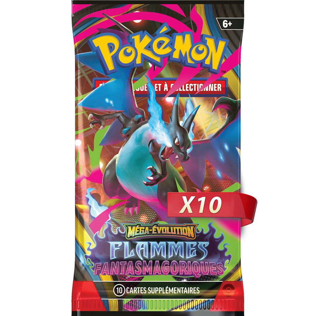 Plongez dans l’univers flamboyant de la nouvelle extension Pokémon JCC : Méga-Évolution – Flammes Fantasmagoriques. Méga-Dracaufeu X-ex et Méga-Ectoplasma-ex mènent la charge, accompagnés de puissants Pokémon de type Feu et Obscurité. Chaque booster vous réserve la surprise de nouvelles cartes inédites, parfaites pour enrichir votre deck ou votre collection.